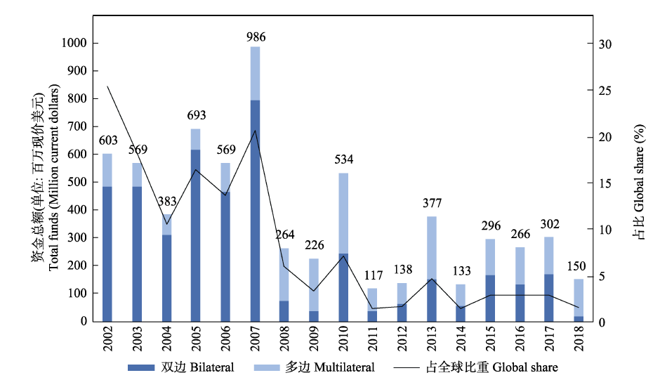图5 中国生物多样性受援资金总额和占比(根据本研究搜集数据整理计算)