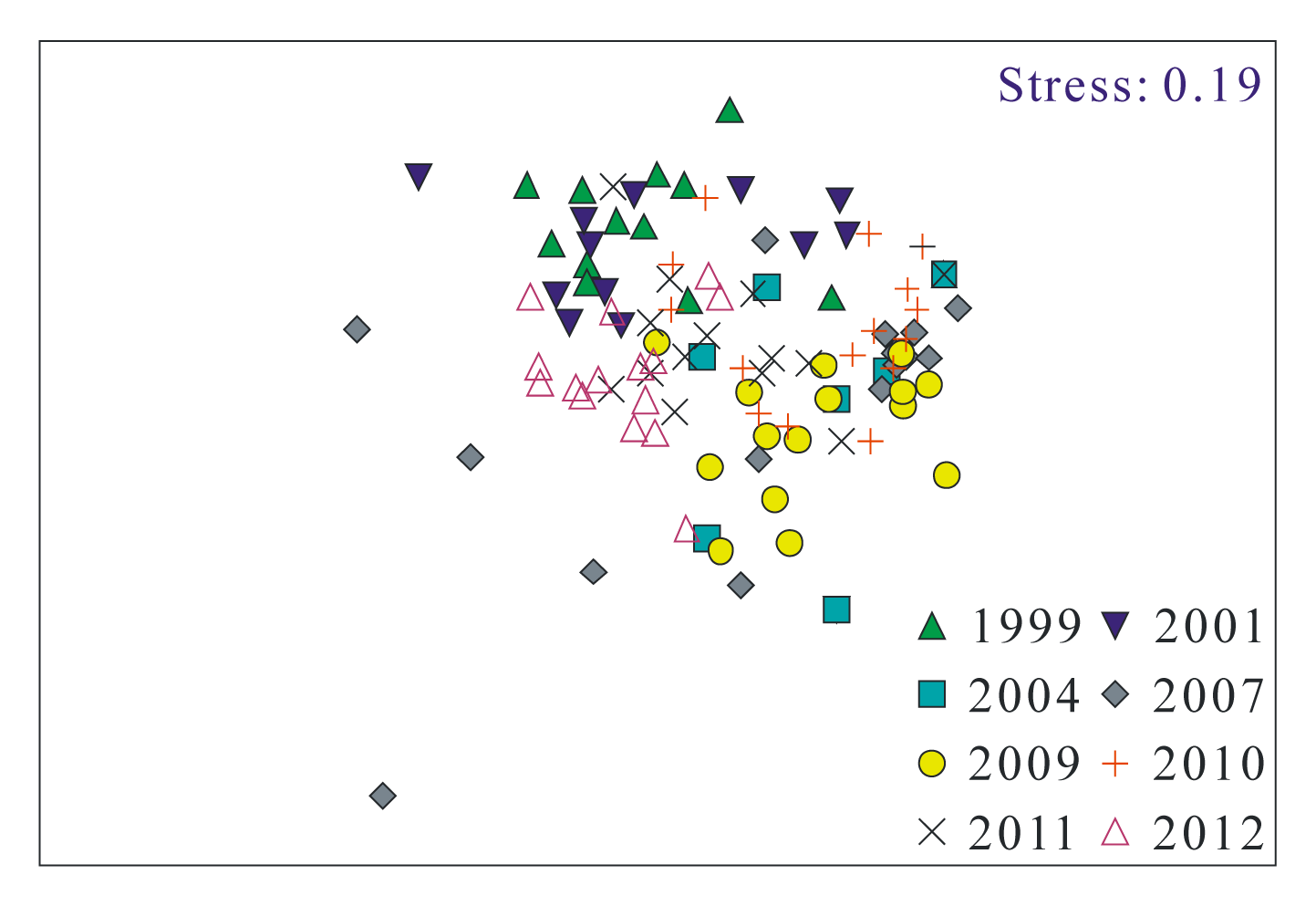 图4 不同时段长江口及其邻近海域无脊椎动物丰度的NMDS排序