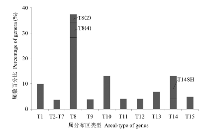 Fig. 2 Percentage compositions of alpine flora of 14 main mountains in China. T1, Cosmopolitan; T2-7, Tropic types; T8-11, North temperate types; T12-13, Mediterranean types; T14, East Asia types; T14SH, Sino-Himalayan type; T15, Endemic to China.