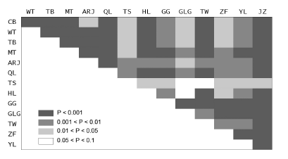 | 地理距离|最热月最高温差异 Geographic | MTWM distance | 0.5979 | 0.001 |