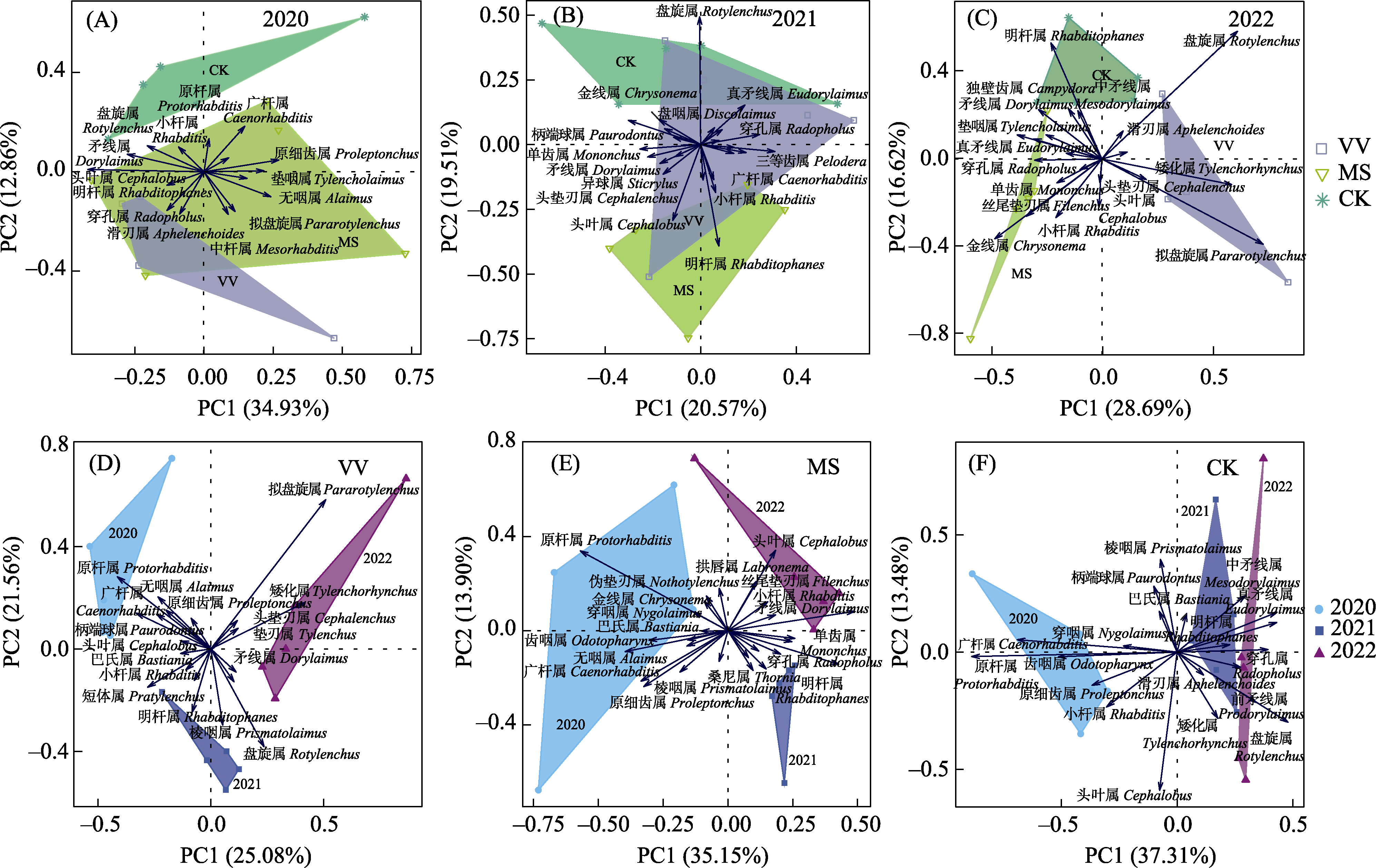 图1 不同年份(A, B, C)和不同处理(D, E, F)土壤线虫群落组成主成分分析。VV: 光叶紫花苕; MS: 紫花苜蓿; CK: 对照。