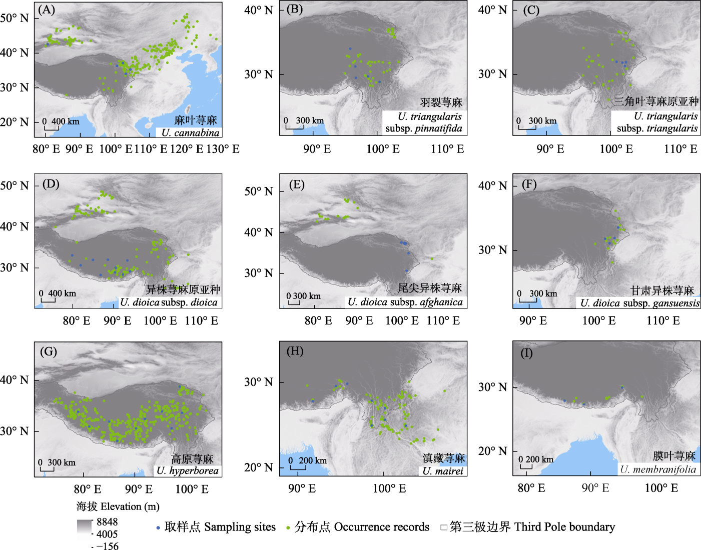 第三极(the Third Pole)是指青藏高原、横断山脉、喜马拉雅山脉、兴都库什山脉和喀喇昆仑山脉等组成的区域(Qiu, 2008; Liu J et al, 2022)。区域内包括了中国西南山地、印缅地区、喜马拉雅和中亚山地4个全球生物多样性热点地区(Myers et al, 2000; Liu J et al, 2022)。尽管该地区有较长的植物分类学研究历史, 但由于区域内复杂的气候、地质和地理环境, 加之地缘政治冲突, 目前尚不知确切的植物物种多样性(Ahmad et al, 2025; Yang et al, 2025), 初步估计约有18,000多种维管植物(Liu J et al, 2022), 亟需对不同类群开展深入研究。我国荨麻属植物约有10种在第三极及其周边区域广泛分布, 这包括麻叶荨麻分支以及滇藏荨麻(U. mairei)和膜叶荨麻(U. membranifolia)等(图1), 它们主要分布于西藏、青海以及新疆南部、甘肃南部、四川西部、云南西北部等地(图2)。这些荨麻属植物是重要的药食同源植物, 具有丰富的民俗文化和经济价值(帝玛尔·丹增彭措, 1986; Chen et al, 2003; Viotti et al, 2022; Wang et al, 2023)。例如, 在第三极广泛分布的高原荨麻和异株荨麻原亚种, 在藏语里称为“sabo”, 相传是藏地著名密教修行者米拉日巴大师在山洞修行时的主要食物, 为纪念米拉日巴大师, 当地牧民至今仍保留着每年春天食用高原荨麻嫩叶的传统。高原荨麻还可作为冬季重要的食饲来源, 或研磨成粉掺到青稞面或青稞饼中供牲畜或人类食用。此外, 三角叶荨麻、滇藏荨麻等物种, 同样被当地人们作为重要的药、食、饲来源(中国科学院西北高原生物研究所, 1991; 苏日娜等, 2018)。这些植物在第三极生态系统中扮演着重要角色, 既与人们生计相关, 又与精神信仰和医药价值密切关联。然而, 高原荨麻、异株荨麻、三角叶荨麻等近缘种在形态上十分相似(图1), 地理分布有所重叠(图2), 因此其在形态、地理和遗传上有何不同需要进一步澄清。