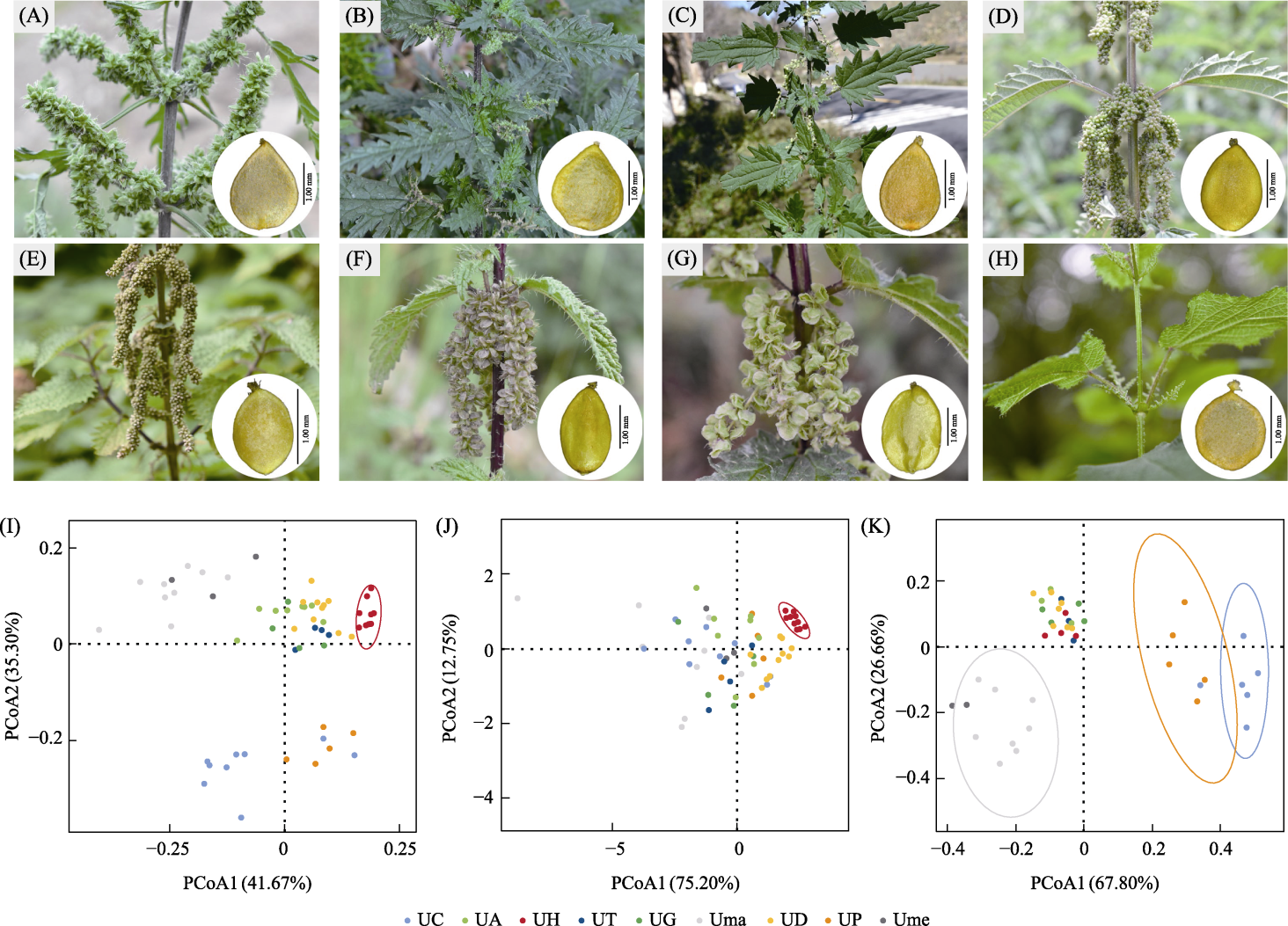 第三极6种荨麻属植物的形态性状。(A)-(H)生态照和瘦果形态: (A)麻叶荨麻; (B)羽裂荨麻; (C)三角叶荨麻原亚种; (D)尾尖异株荨麻; (E)甘肃异株荨麻; (F)异株荨麻原亚种; (G)高原荨麻; (H)滇藏荨麻。(I)-(K) PCoA分析结果: (I)所有性状; (J)数量性状; (K)质量性状。圆形表示95%的置信区间。UC: 麻叶荨麻; UA: 尾尖异株荨麻; UH: 高原荨麻; UT: 三角叶荨麻原亚种; UG: 甘肃异株荨麻; Uma: 滇藏荨麻; UD: 异株荨麻原亚种; UP: 羽裂荨麻; Ume: 膜叶荨麻。