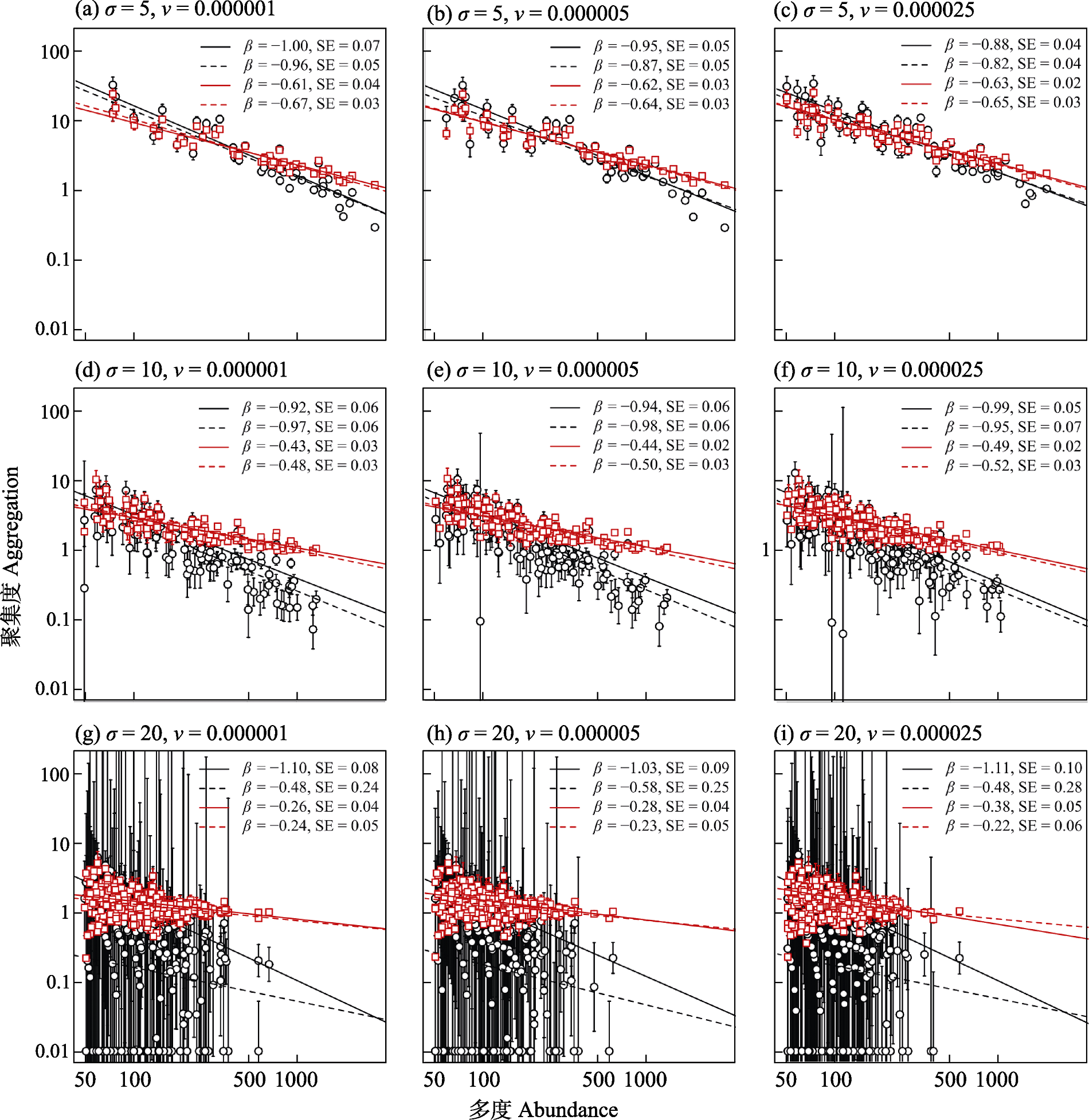 不同参数组合(扩散参数σ和成种速率ν)模拟空间明晰中性群落中的聚集度-多度关系。黑色小圆圈与对应的回归线代表以负二项分布参数k度量聚集度(聚集度 = 1/k)的结果, 红色小方块和对应回归线代表以kff度量聚集度的结果。实线为加权回归, 虚线为非加权回归。β和SE为回归斜率和对应的标准误。