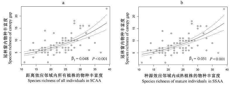 Fig. 3 The effect of species richness in adjacent area on species richness of canopy gap (Generalized linear regression model). (a) Species richness of all individuals in the adjacent area where species composition is spatially correlated with survivors in the canopy gap (SCAA); (b) Species richness of mature individuals in the adjacent area where is the seed source of canopy gap (SSAA). A fitted curve (lines) was shown with 95% confidence bands (dash lines).