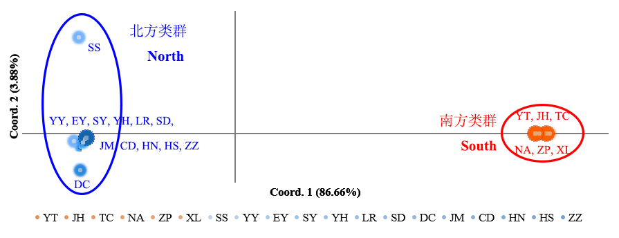 | 两个类群(南方群体, 北方群体) Two groups (Regions: South, North) | ||||||
