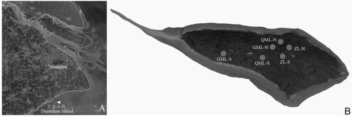 Fig. 1 The location of Dajinshan Island and soil fauna sampling sites. ZL, bamboo forest; QML, arboreal forest; GML, shrubbery; N, North slope; S, South slope.