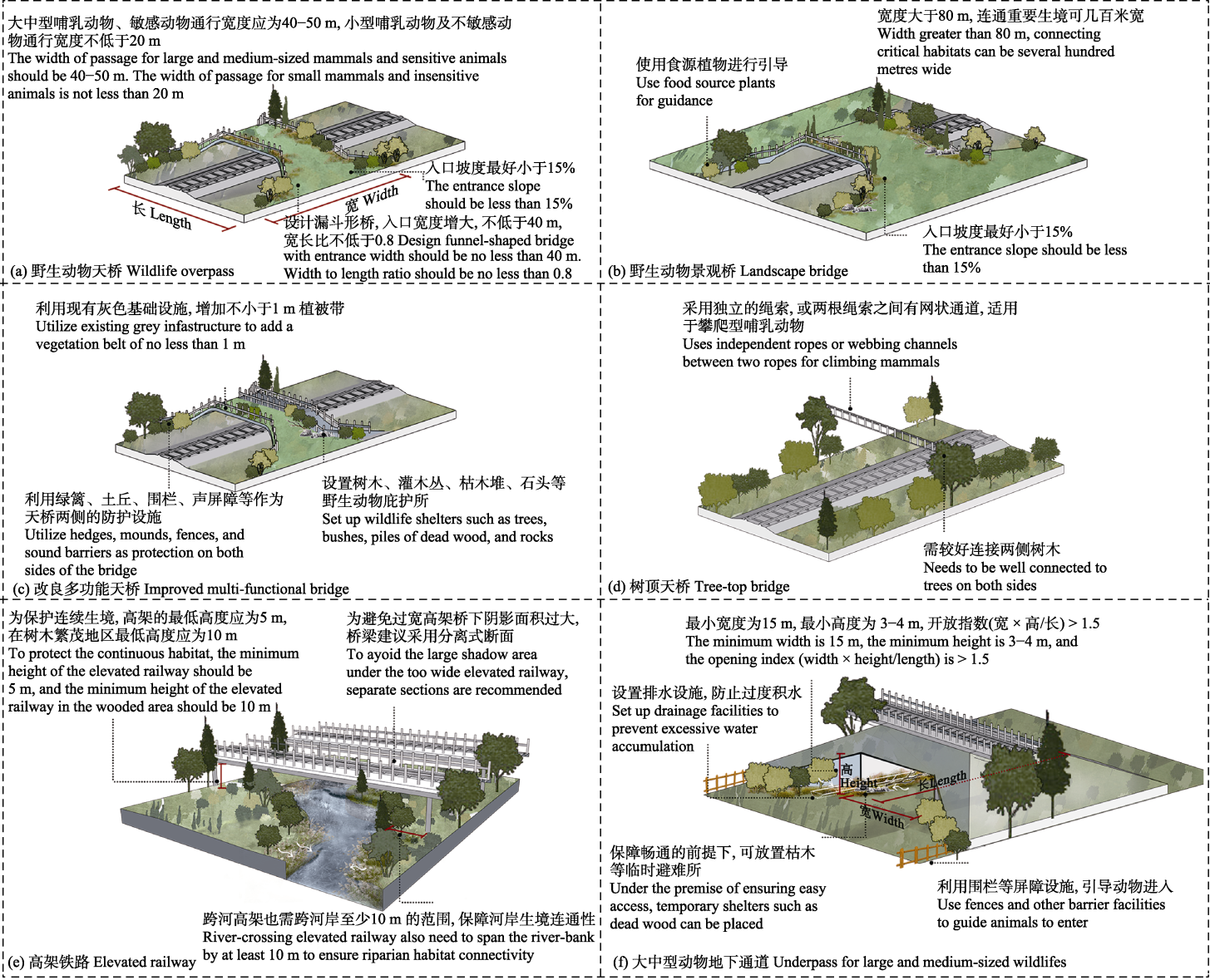 Fig. 1 Schematic of railway lateral connectivity/wildlife passage. (a) Wildlife overpass; (b) Landscape bridge; (c) Improved multi-functional bridge; (d) Tree-top bridge; (e) Elevated railway; (f) Underpass for large and medium-sized wildlife.