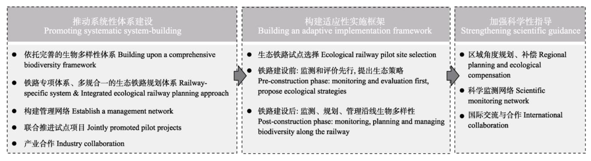 | 沿线植被管理 Vegetation management along railways | 植被规划: 近轨道处植被应降低对动物的吸引力, 提升司机的可见度; 远离轨道处植被形成异质性半自然生境 Vegetation planning: the vegetation next to the railway should minimize wildlife attraction while maintaining clear sightlines for train operators; away from the railway, vegetation should form heterogeneous semi-natural habitats |