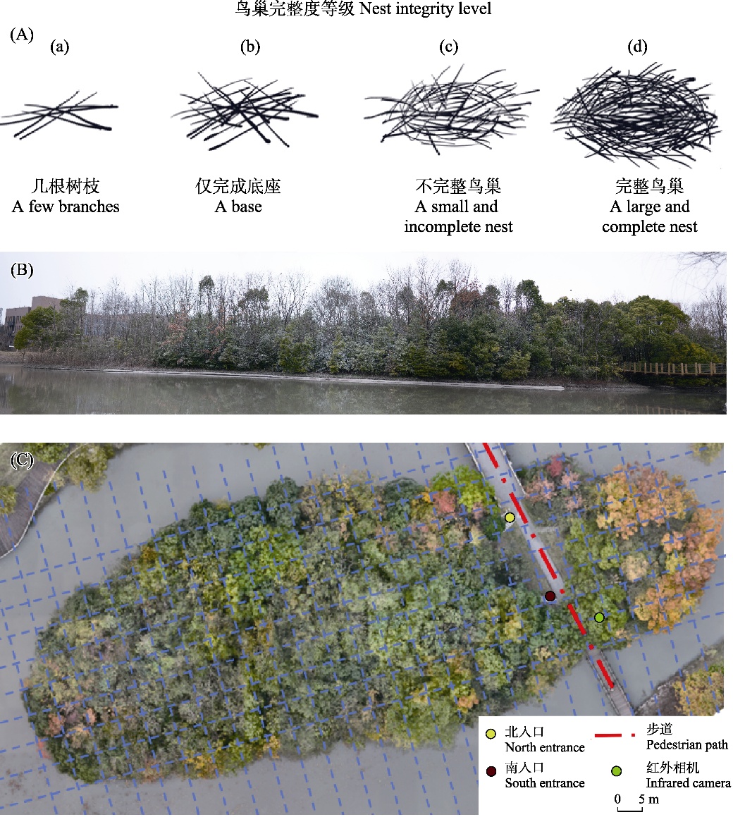 Fig. 1 The illustration of the classification criteria for each nest completeness level (A), and the overview of the ecological island at Minhang Campus of East China Normal University in Shanghai (B, C)