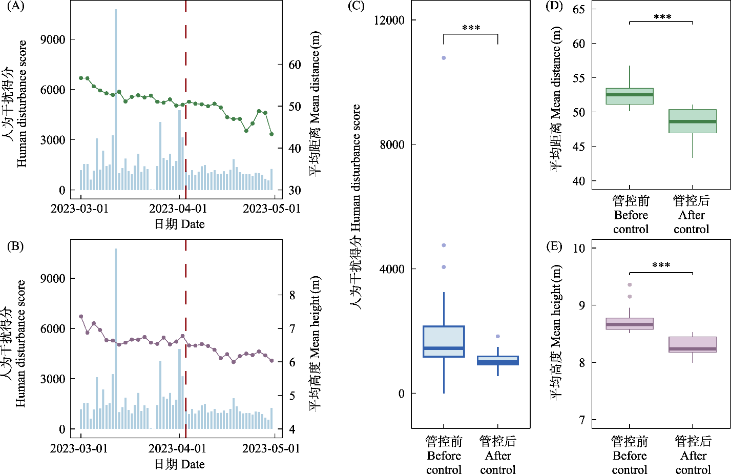 Fig. 2 Trends over time in human disturbance intensity, the average distance of nest sites from the path, and the average nest height. In panels A and B, the blue bars represent daily scores of human disturbance intensity. The green and purple scatters represent the dynamics of the average distance of nest sites from the path and the average nest height. The thick red line represents the control date (April 3rd). Panels C, D and E are the box plots of the comparison of the human disturbance score, the average distance of nest sites from the path and the average nest height before and after control, respectively. After control, human disturbance intensity decreased significantly (P < 0.001). The average distance of nest sites from the path decreased significantly (P < 0.001), and the average nest height also decreased significantly (P < 0.001).