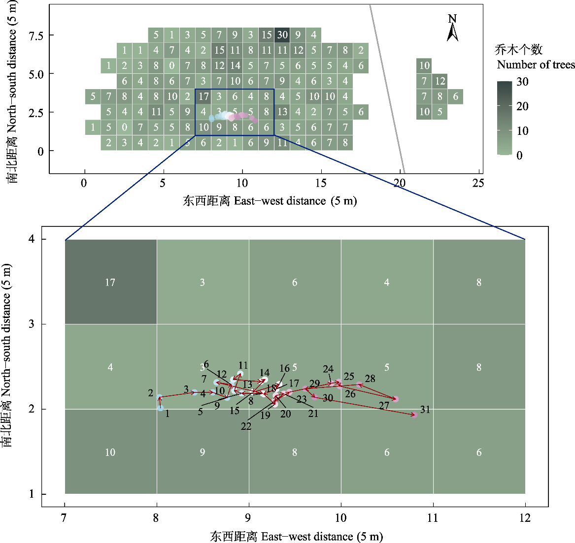 Fig. 3 Dynamics of the horizontal weighted center of nest sites over time (obtained with the accurate nest sites). The quadrats of the ecological island are displayed in a grid. The number of trees in each quadrat is represented by the green color of the quadrat—ranging from light to dark as the number of trees increases—and marked with white numbers in the grid. The survey was conducted 31 times, and black numbers (1 to 31) point to the horizontal weighted center of the nest sites obtained from each survey. The arrows indicate the moving direction from the horizontal weighted center of the nest sites in the previous survey to that in the next survey. The grey diagonal line indicates the location of the pedestrian path.
