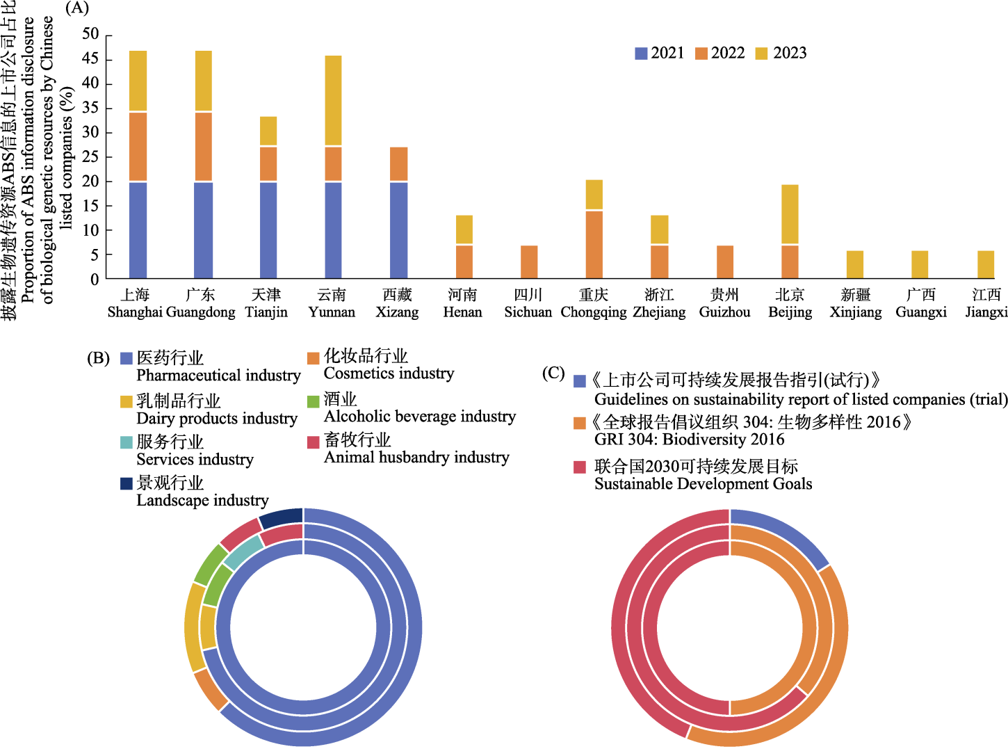 Fig. 1 The regional location (A), industry classification (B) and reference standards (C) of access and benefit-sharing (ABS) information disclosure of biological genetic resources by Chinese listed companies from 2021 to 2023. Data source: Sustainability reports of listed companies on the Shanghai Stock Exchange and Shenzhen Stock Exchange. Provinces (municipalities, autonomous regions) with no data are not shown in Figure A. Figures B and C show the years 2021, 2022 and 2023 in order from the inner circle to the outer circle.