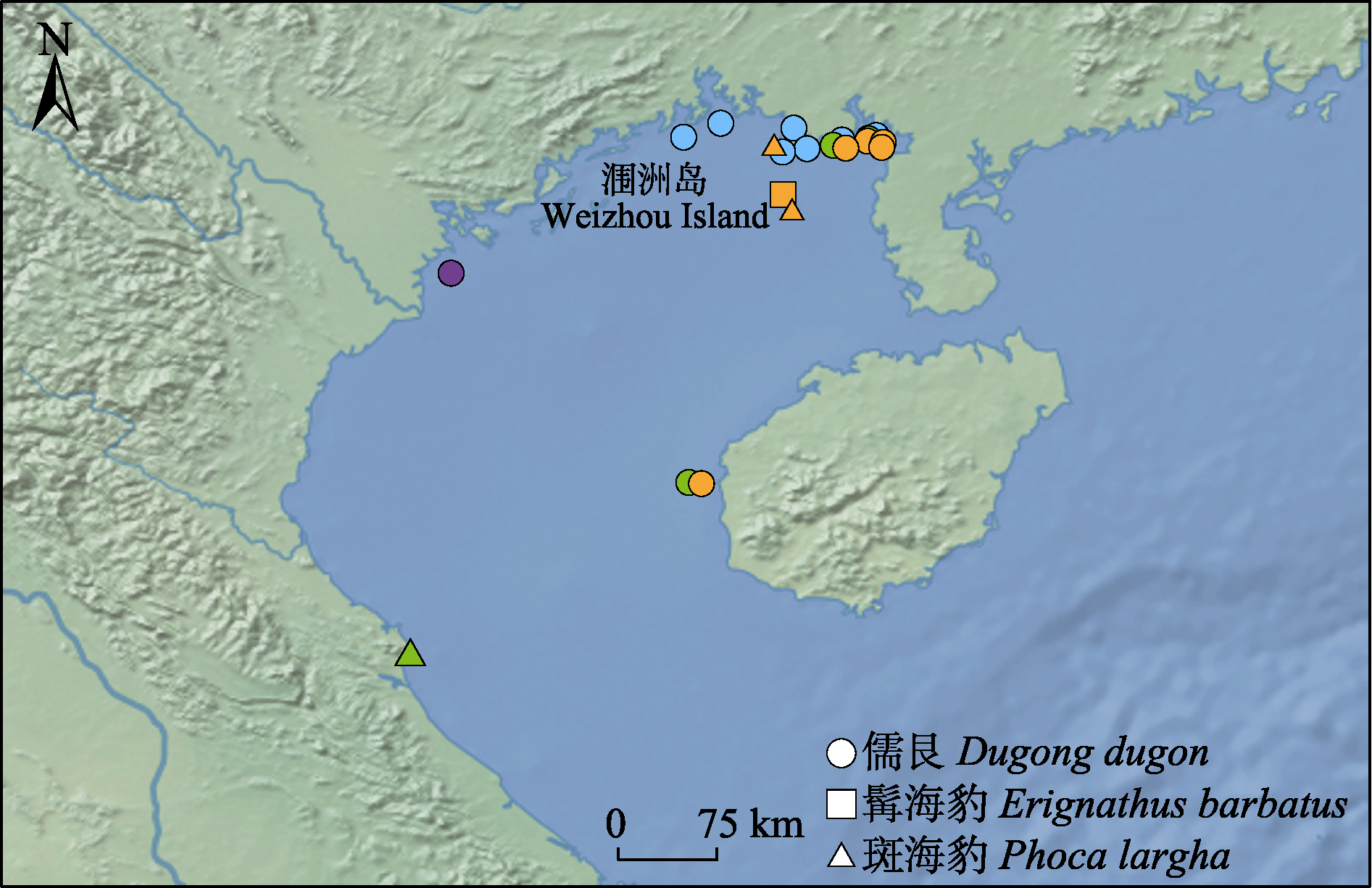 Fig. 2 Geographical distribution of Sirenia and Carnivora in the Beibu Gulf. Blue, Stranding; Yellow, Wild sighting; Green, Bycatch/catch; Purple, Specimen.