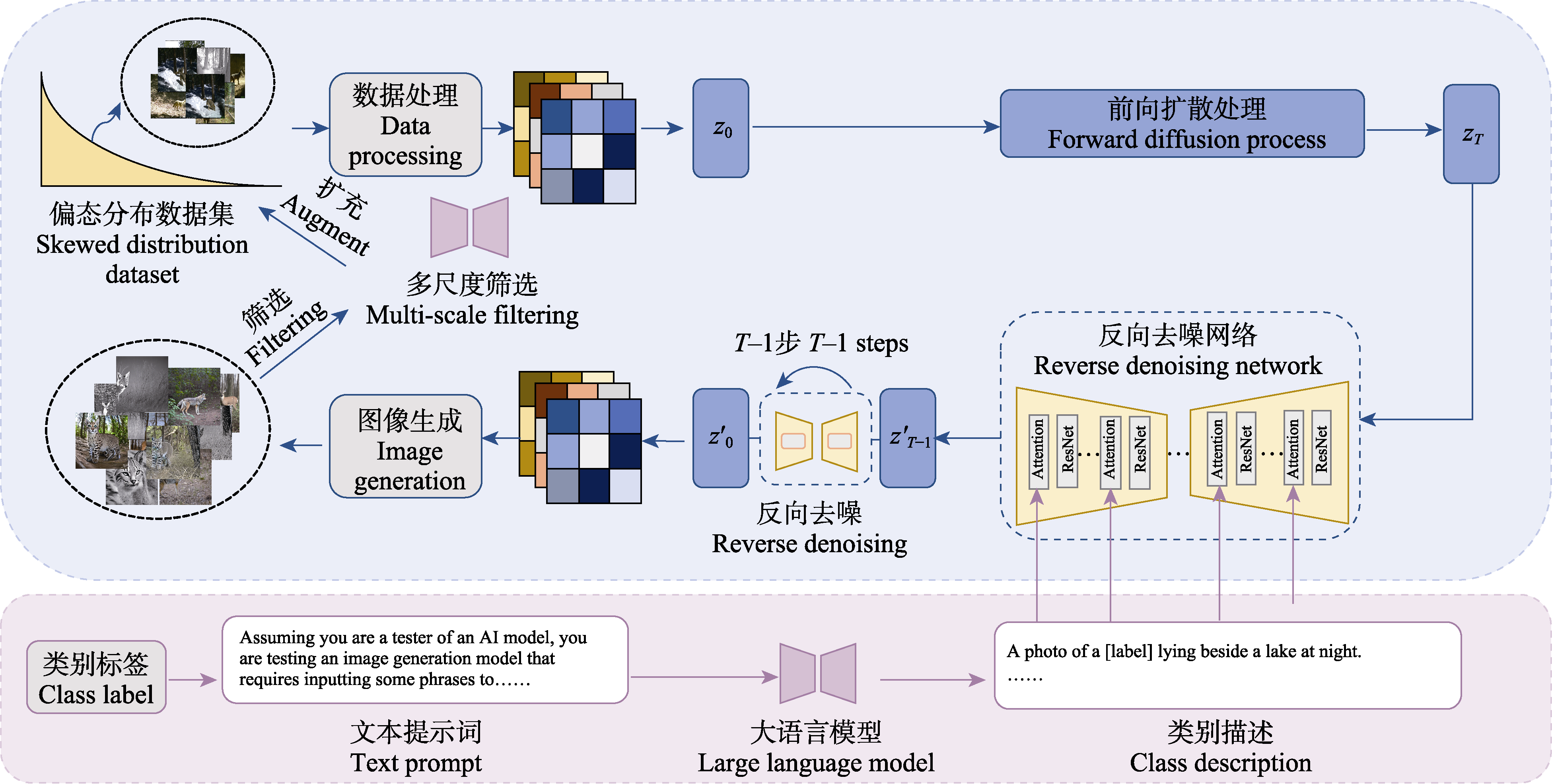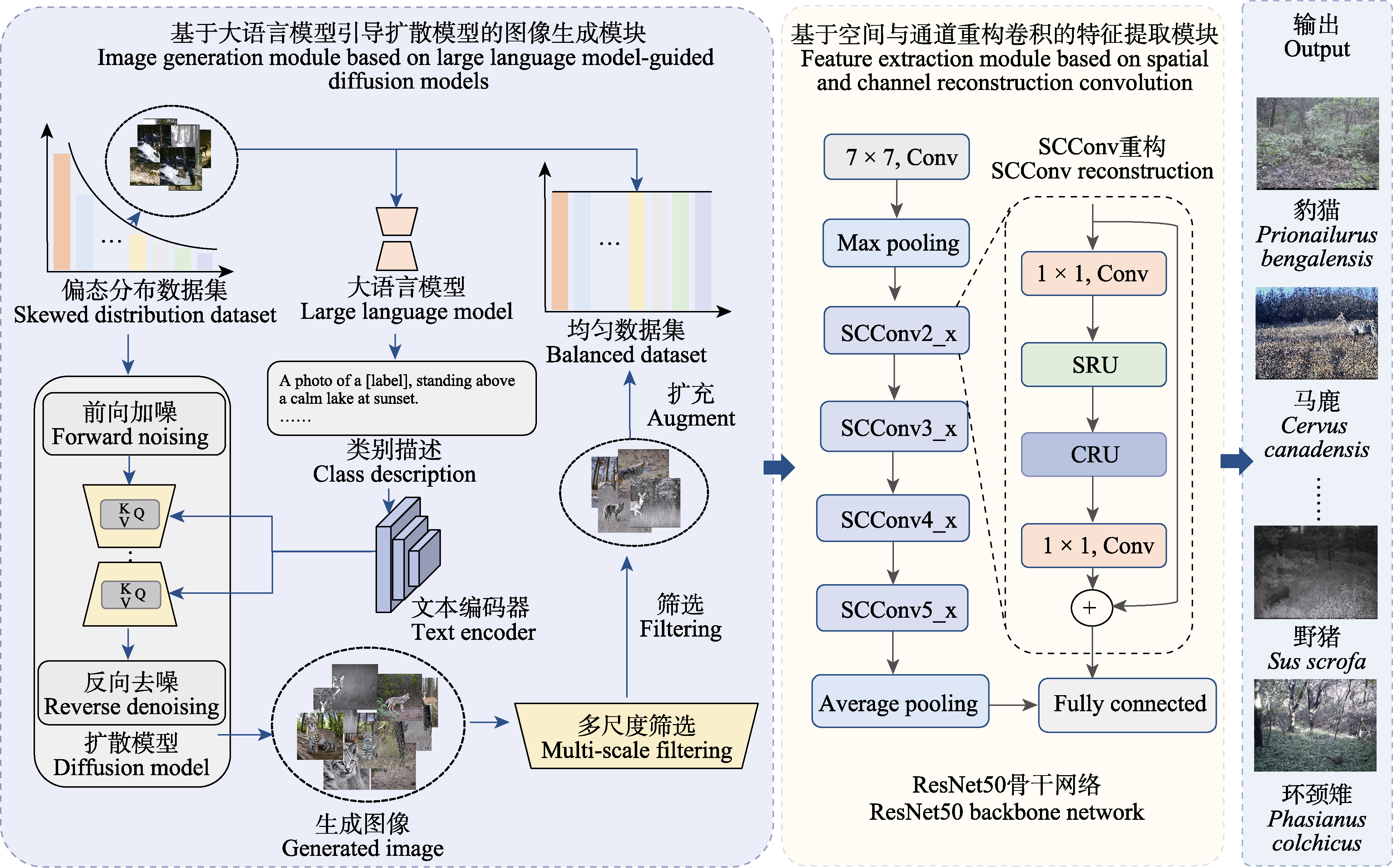 Methods: To address this issue, this study proposed a novel method for wildlife recognition named Diff-SCC, which integrated data generation using a diffusion model and feature reconstruction. Specifically, rich semantic descriptions of low-frequency categories were first generated using a large language model to guide the diffusion model in synthesizing additional samples. A multi-scale negative sample filtering strategy was then introduced to assess image quality from pixel, feature, and semantic levels, enhancing the diversity and balance of low-frequency categories’ features. Furthermore, an SCConv module was incorporated into the backbone network to improve spatial and channel modeling, focusing more effectively on foreground regions while reducing redundant computation.