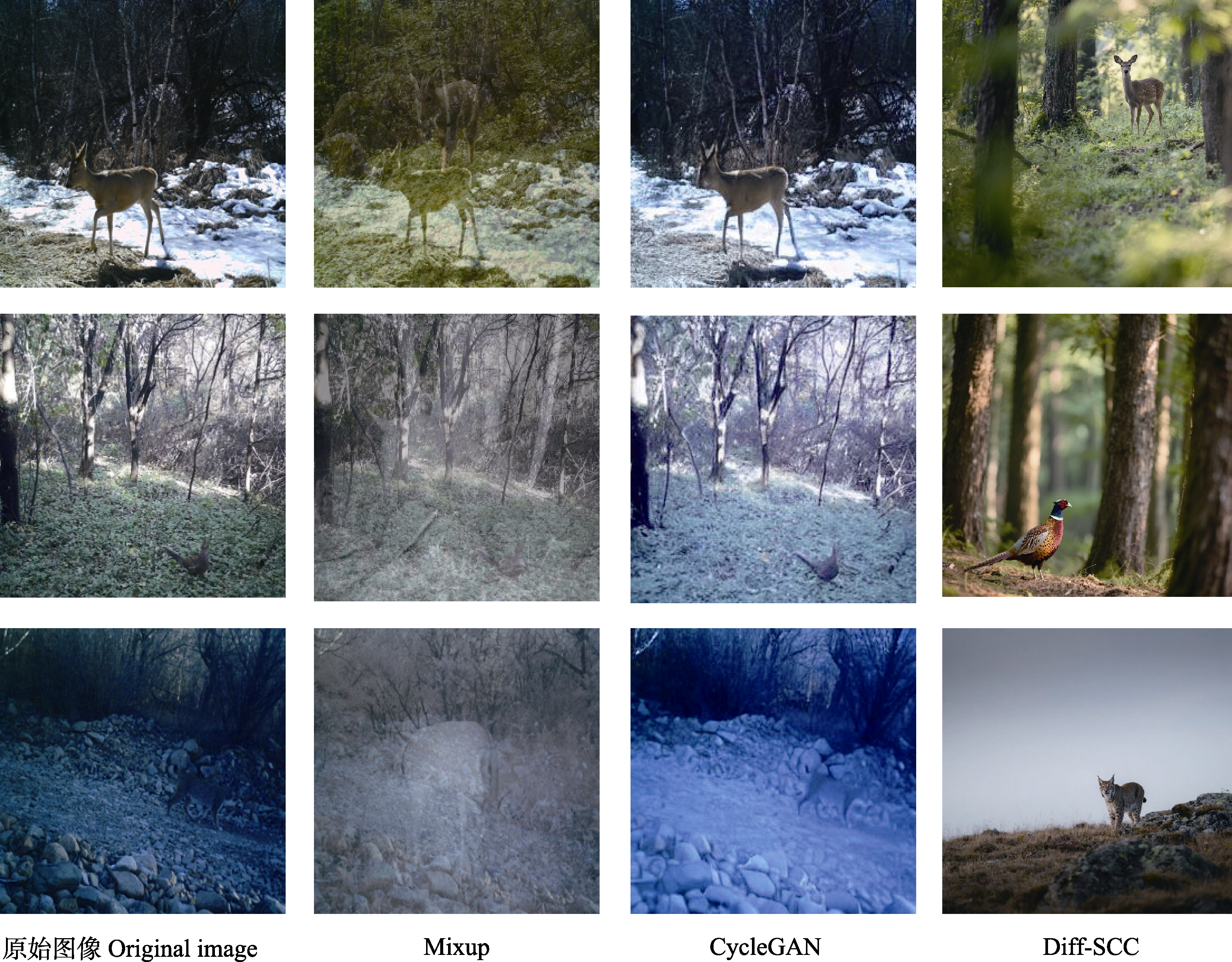 Results: This paper conducted comparative experiments on a self-built wildlife dataset from Ulanba National Nature Reserve, which comprised 12 wildlife categories, and on the public wildlife NACTI dataset. Results showed that the proposed Diff-SCC model achieves overall recognition accuracies of 78.71% and 80.84% on the two datasets, respectively. Notably, the recognition accuracy of low-frequency classes improved by 9.96% and 9.99% over the baseline model, demonstrating the effectiveness of the proposed method in handling skewed data and recognizing rare species.