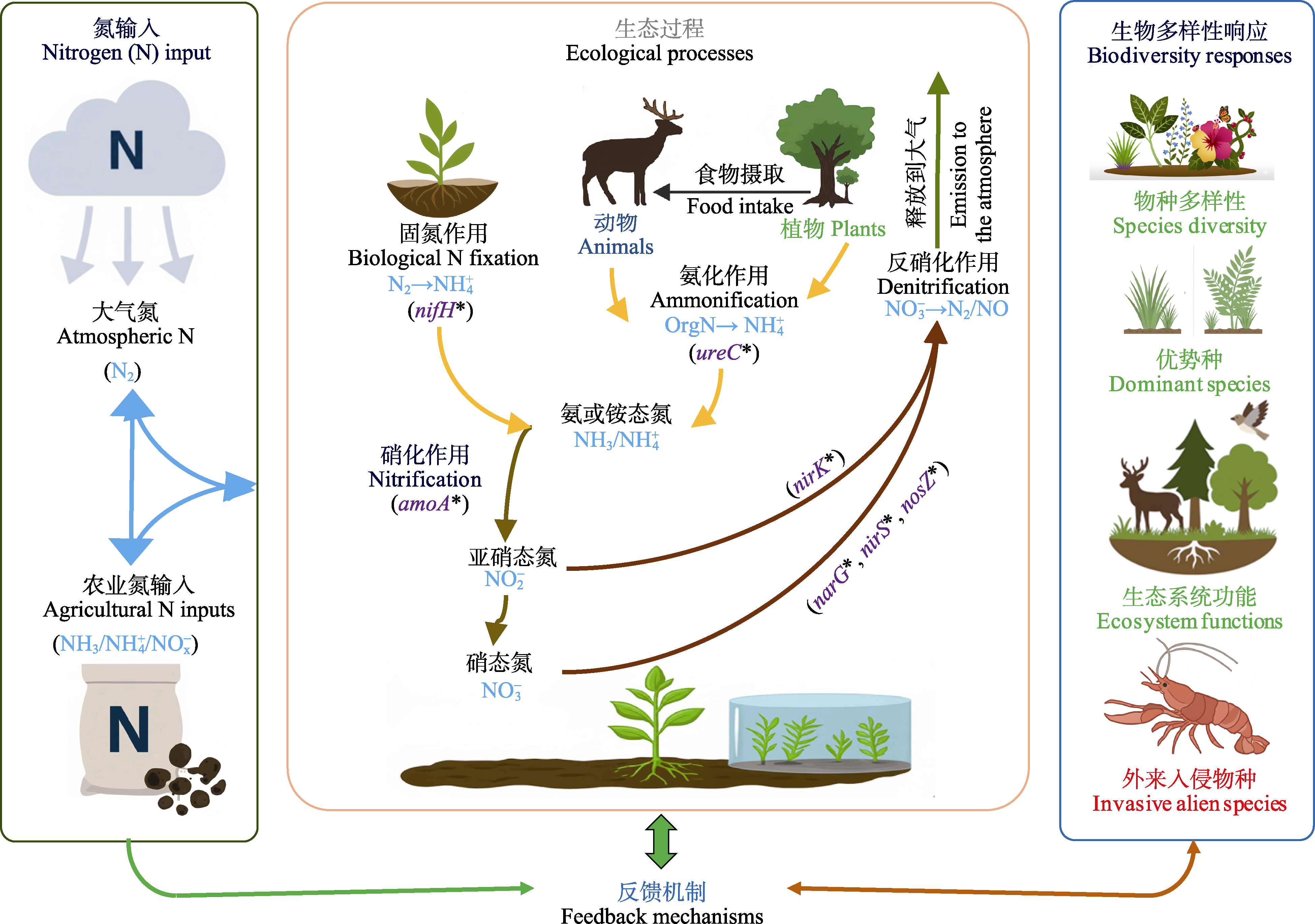 Progresses: A growing body of evidence demonstrates that the ecological consequences of nitrogen inputs are strongly context dependent. In ecosystems characterized by low background nitrogen availability, moderate nitrogen enrichment may temporarily enhance primary productivity and, in some cases, support short-term increases in local biodiversity. In contrast, sustained or excessive nitrogen inputs are consistently associated with negative biodiversity outcomes, including species loss, community homogenization, and functional simplification. These effects are mediated by multiple interacting processes, such as shifts in soil physicochemical conditions, altered nitrogen availability and stoichiometric balance, and changes in microbially regulated nitrogen transformation pathways. Nitrogen enrichment often favors fast-growing, resource-acquisitive species, intensifying competitive exclusion and reducing niche differentiation, while simultaneously restructuring microbial communities and their functional capacities. Importantly, biodiversity itself can influence nitrogen dynamics. Functional diversity among plants, microorganisms, and soil fauna contributes to more efficient nitrogen use, reduced nitrogen losses, and greater ecosystem resistance to external nitrogen stress. Building on these insights, research on nitrogen inputs and associated ecological processes has increasingly informed biodiversity monitoring, ecological risk assessment, and ecosystem restoration, highlighting the practical relevance of process-oriented nitrogen research.