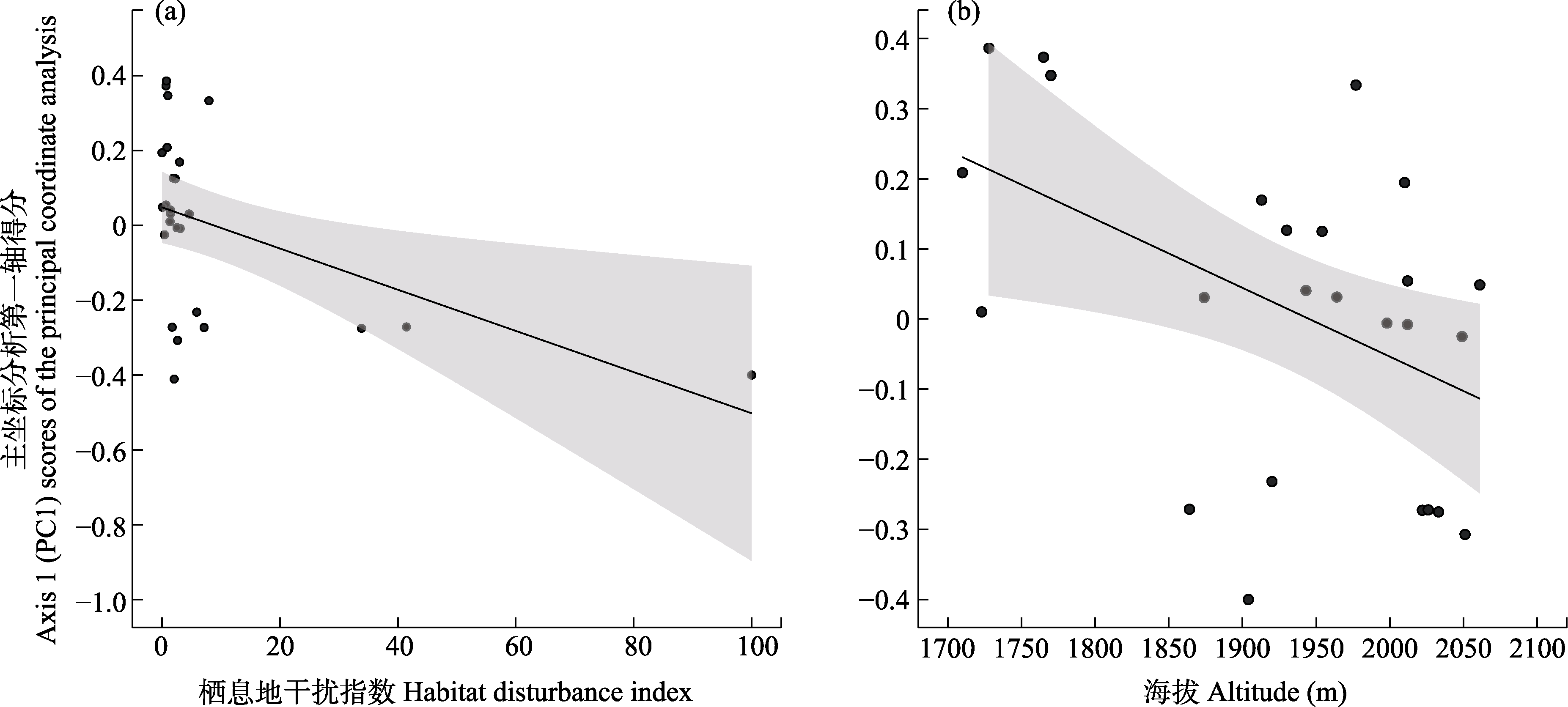 Table 2 Results of linear mixed models of principal axis scores of principal coordinates analysis (PCoA) in relation to the habitat disturbance index (HDI) and altitude