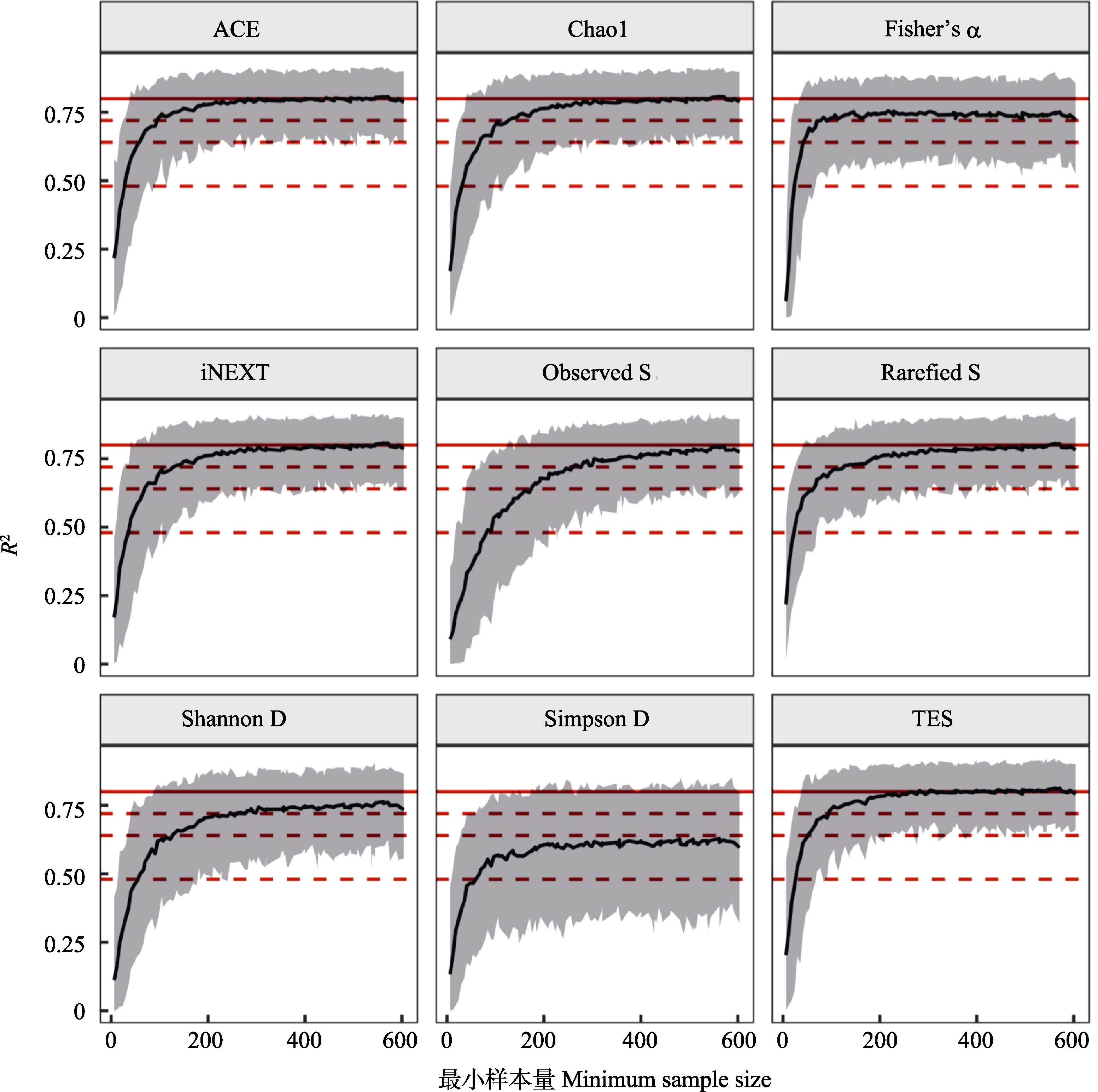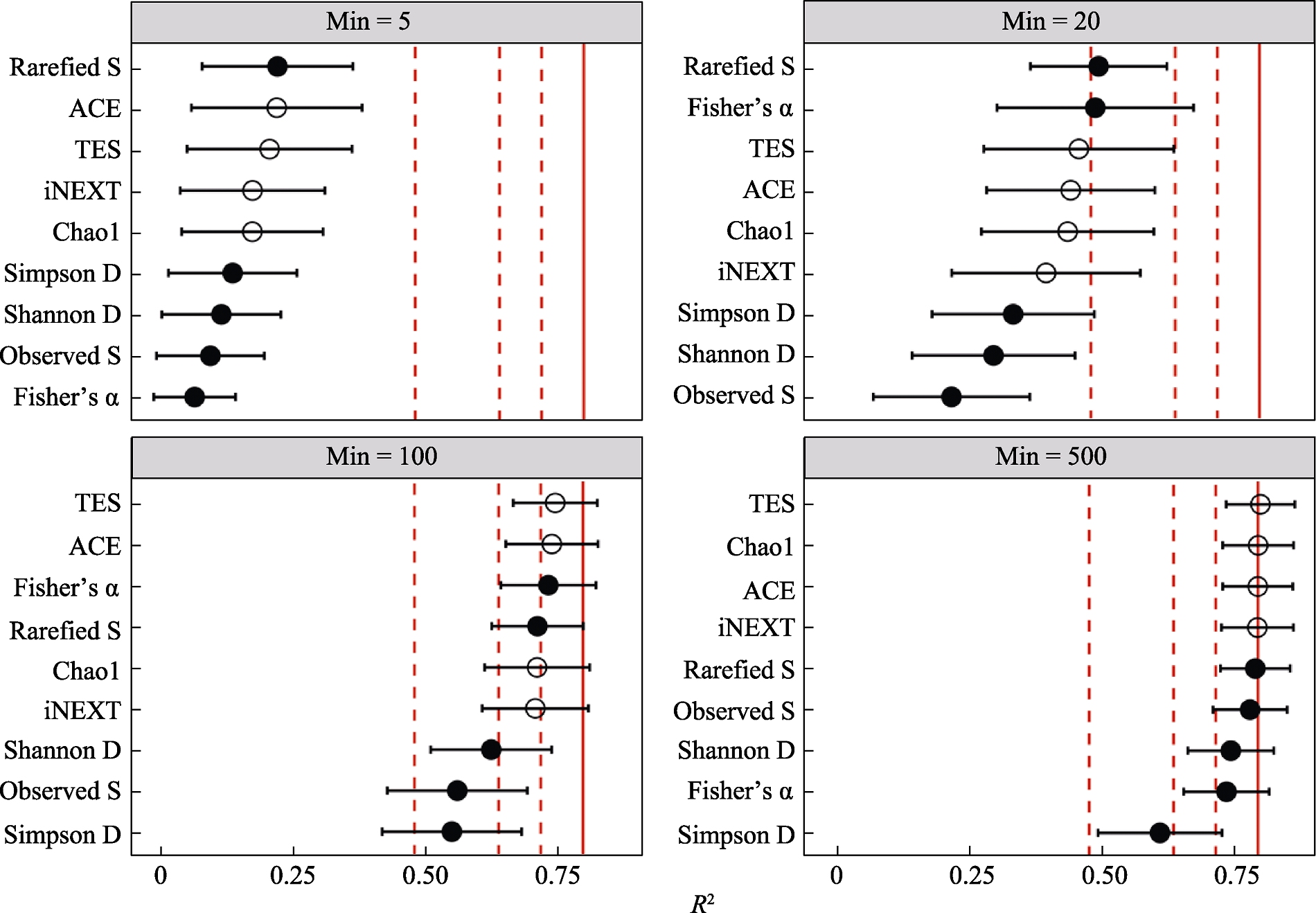 Fig. 3 Coefficient of determination (R2) between each α-diversity metric and the environmental gradient under four minimum-sample scenarios (Min = 5, 20, 100, 500). (mean ± SD, 200 simulations). Solid dots are directly calculated diversity indices, and open symbols are richness estimators. Red three dashed red lines refer to R2 = 0.48 (60% set value), 0.64 (80% set value), and 0.72 (90% set value), respectively, while the solid red line represents R2 = 0.80 (theoretical setting value).
