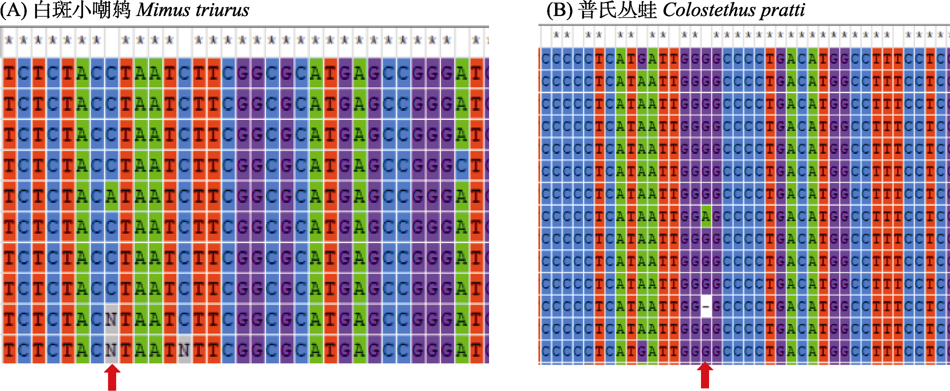 Fig. 2 An example of species data for sequences of equal length with missing bases (partial range). Red arrows indicate the nucleotide segregation sites where missing bases are found.