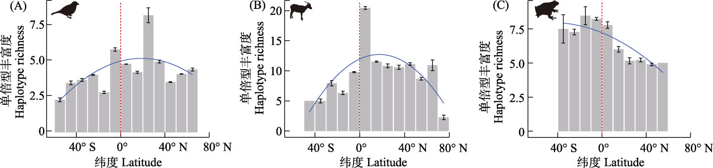 Fig. 3 The latitudinal gradients in haplotype richness of birds (A), mammals (B), and amphibians (C). The regression lines (blue lines) represent the predictions of the beta regression model. The red dashed lines show the equator.