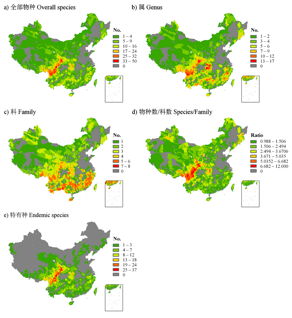 Fig. 1 Richness patterns of the Chinese gymnosperm. a), b), c), and e) are the richness patterns of overall species, genera, families and endemic species, respectively. d) is the pattern of the ratios of gymnosperm species over families.