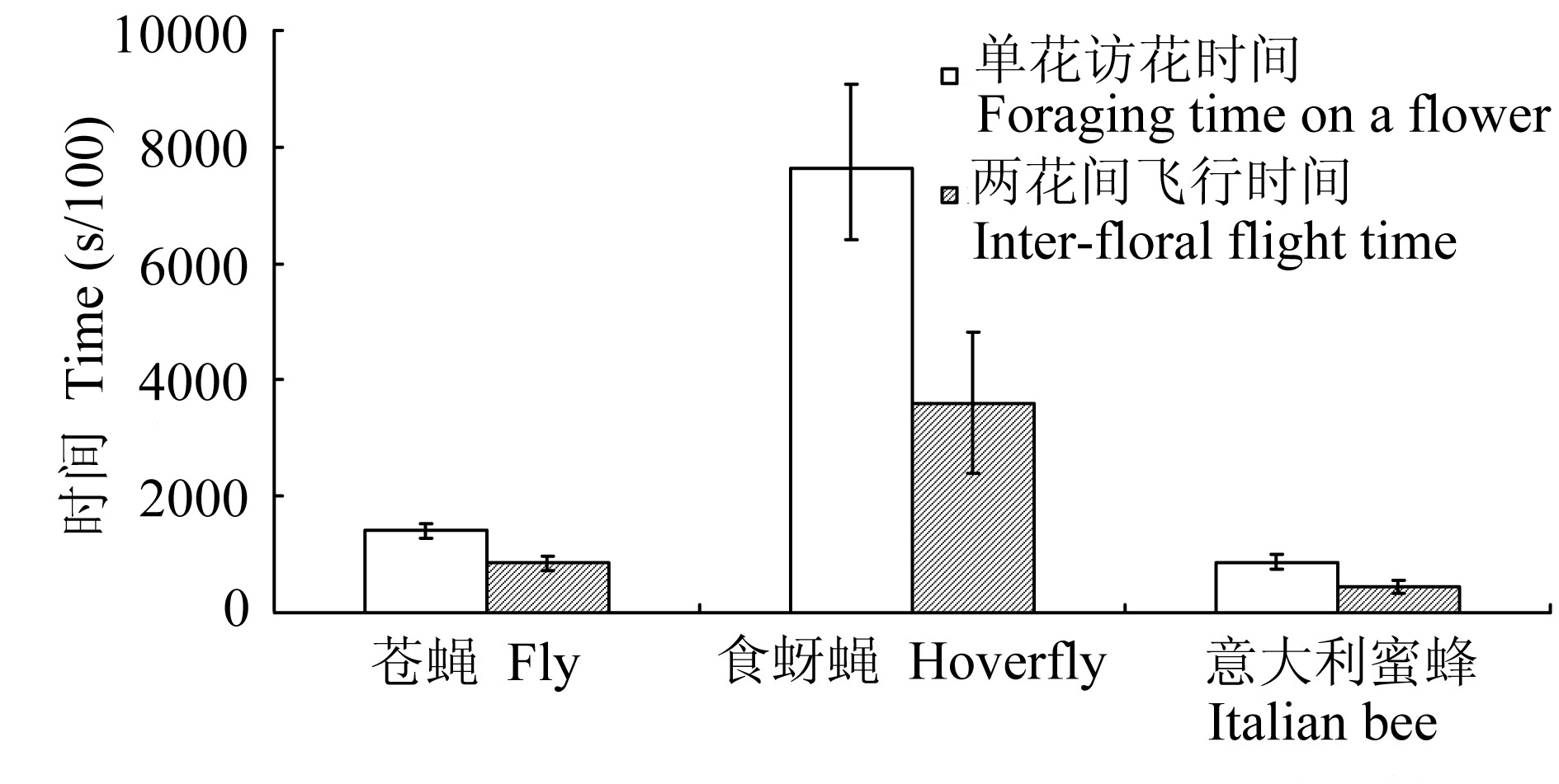 | Fig. 3 Comparisons of the time foraging on individual flowers and moving between two flowers of fly, hoverfly and Italian bee. Therein, samples of the foraging time on a flower and the interfloral flight time are 53, 48; 42, 42; 38, 37, respectively. Time values were recorded with mean±SE. |