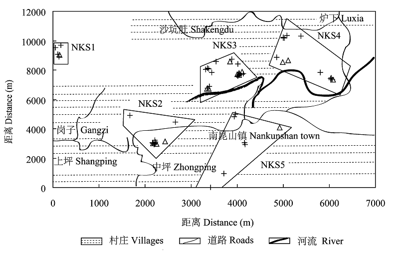 | Fig. 1 Spatial distribution of the fragmented population of Tsoongiodendron odorum in Nankunshan. + represents adult trees, and ? represents seed trees. |