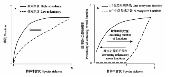 图1 物种丰富度与生态系统功能的关系随冗余度的变化。 (a)物种丧失对假想群落的影响。实线表示当丧失的每个物种都是群落中存在的最有效率的物种时, 功能丧失最大化(物种丰富度由高转低时)。箭头和虚线表示随着冗余的变化, 物种丧失对生态系统功能影响的变化。(b)此图表示概念上维持整体功能的概率如何依赖于功能的数量和物种间多功能冗余的程度。随着某些功能的特化, 多个功能将比单个功能更易受到物种丧失的影响, 这种敏感性将随着冗余度的降低而增加(修改自Gamfeldt et al, 2008)。