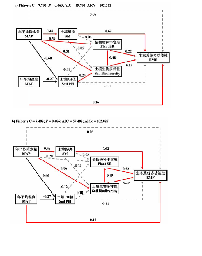 Fig. 2 Structural equation models (SEM) of climate, soil and biodiversity as predictors of ecosystem multifuncitonality (EMF), represented by two hypotheses: (a) plant species richness drives belowground biodiversity (soil biodiversity), and conversely, (b) belowground biodiversity drives plant species richness. Solid black arrows represent positive paths (P < 0.05, piecewise SEM), solid gray arrows represent negative paths (P < 0.05, piecewise SEM), and dotted gray arrows represent non-significant paths (P > 0.05, piecewise SEM). We report the path coefficients as standardized effect sizes. Overall fit of piecewise SEM is evaluated using Shipley’s test of d-separation: Fisher’s C statistic (if P > 0.05, then no paths are missing and the model is a good fit) and Akaike Information Criterion (AIC). MAP: Mean annual precipitation; MAT: Mean annual temperature; SM: Soil moisture; Plant SR: Plant species richness (Adopted from Jing et al, 2015).