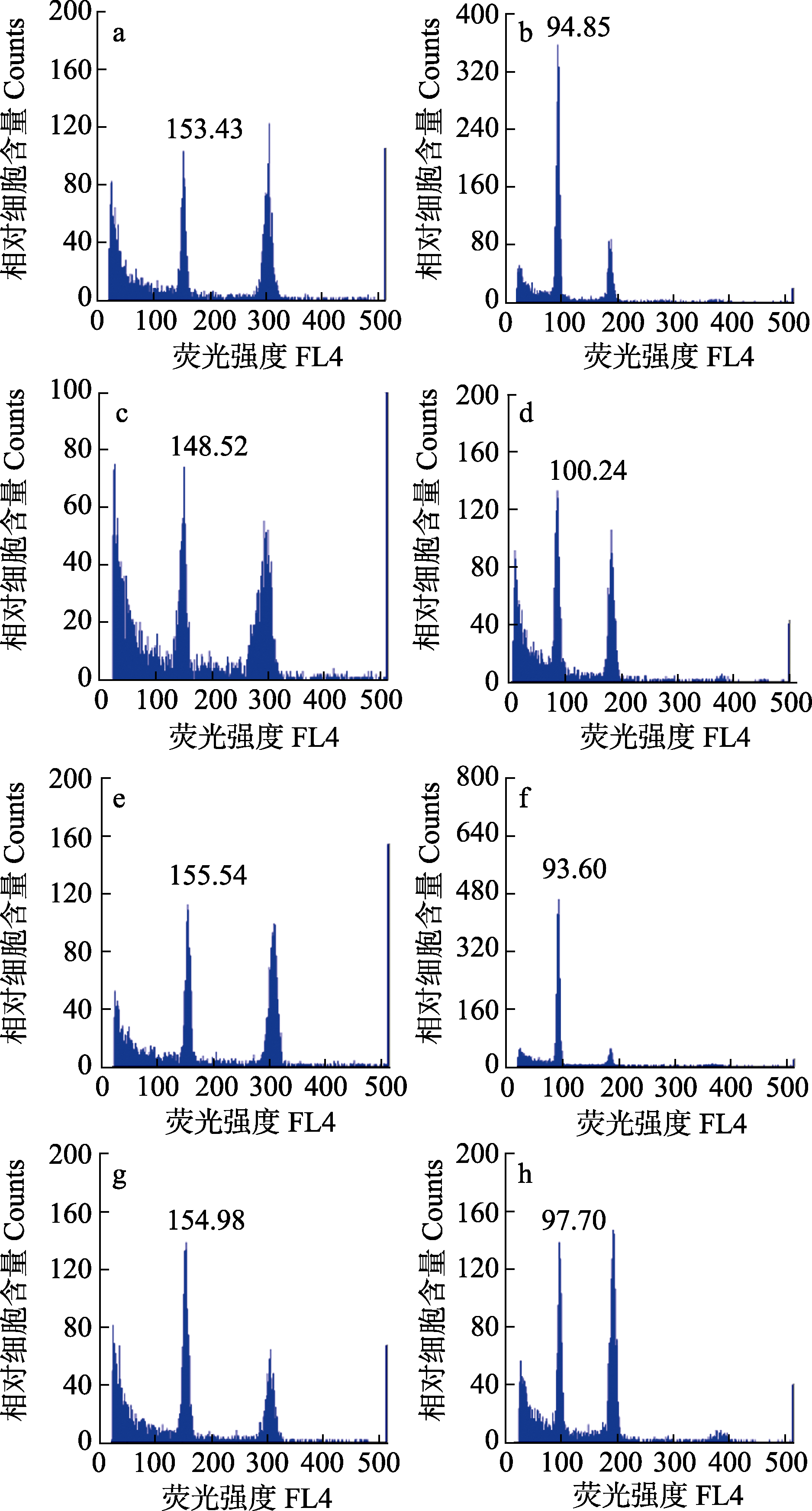 | 图1 印度蔊菜与无瓣蔊菜叶片DNA相对含量。(a)印度蔊菜居群Ri-2; (b)无瓣蔊菜居群Rd-4; (c)印度蔊菜居群Ri-6; (d)无瓣蔊菜居群Rd-1; (e)印度蔊菜居群Ri-1; (f)无瓣蔊菜居群Rd-2; (g)印度蔊菜居群Ri-3; (h)无瓣蔊菜居群Rd-3。居群代号同 |