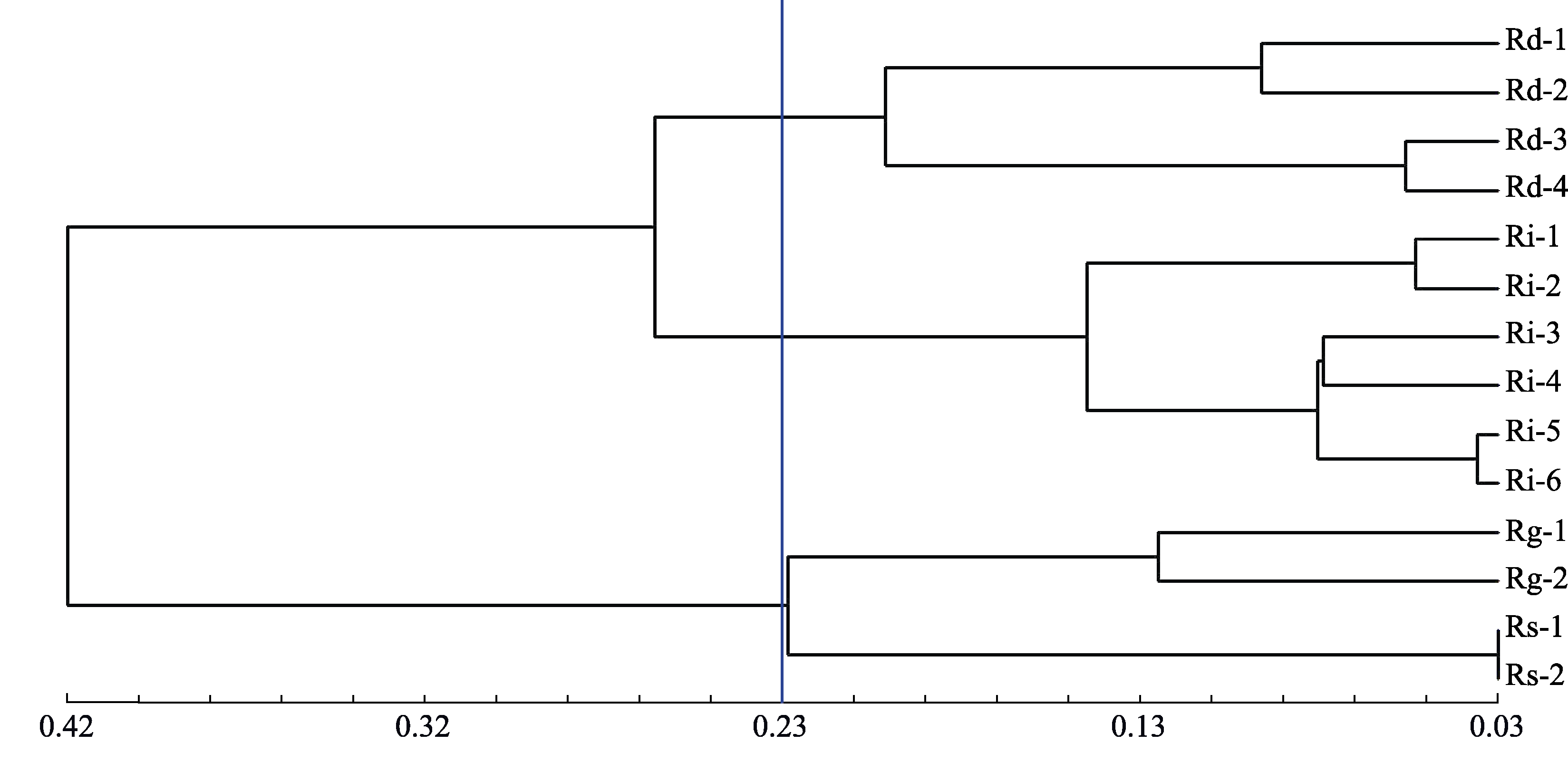 | Fig. 3 Genetic distance of Rorippa indica, R. dubia, and R. globosaand R. sylvestris. Population codes see |