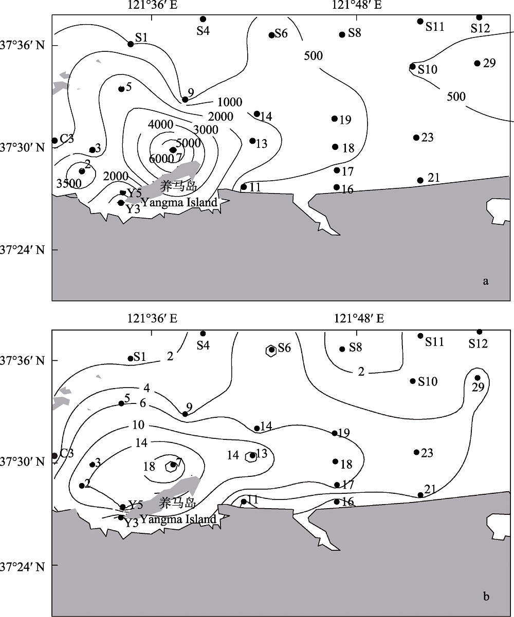 | Fig. 2 Spatial distribution of macrobenthic abundance (a, ind./m2) and biomass (b, g/m2) in the Muping Marine Ranch (Yantai) during August 2016 |