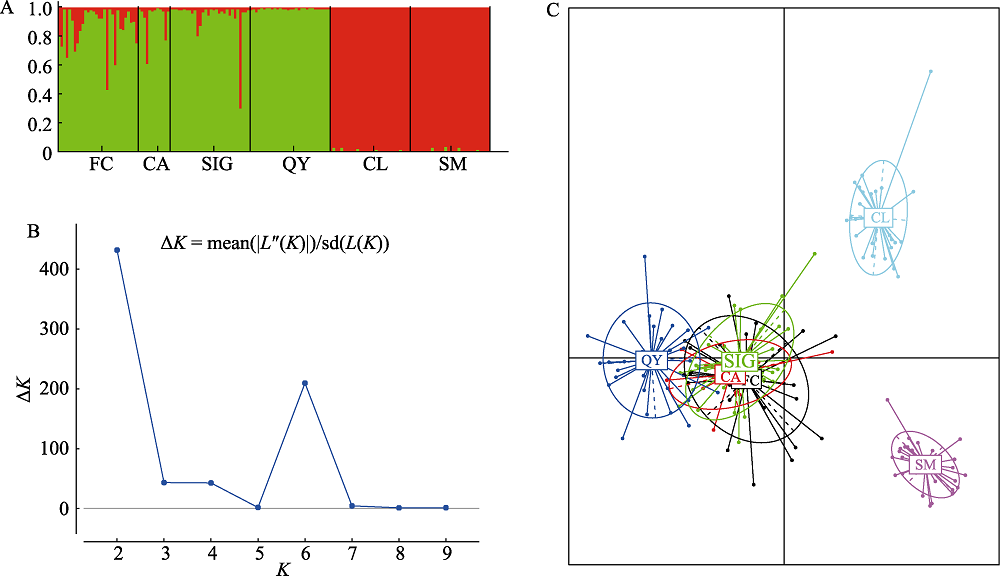 | Fig. 3 Population structure analysis of hatchery and wild populations of Tanichthys albonubes. (A) STRUCTURE plots of K = 2 based on 13 microsatellite loci; (B) ΔK values of the different number of clusters (K); (C) PCA analysis based on 13 microsatellite loci. Population codes refer to |