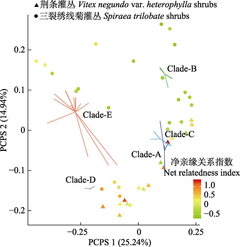 | Fig. 5 Scatter diagram between the first two axes of the principal coordinates of phylogenetic structure (PCPS) for Vitex negundo var. heterophylla (circle) and Spiraea trilobata (triangle) shrub communities. Species included in Clade A-E were shown in |