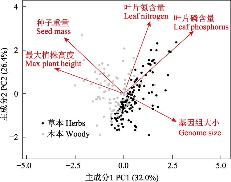 不同生活型被子植物功能性状与基因组大小的关系 |