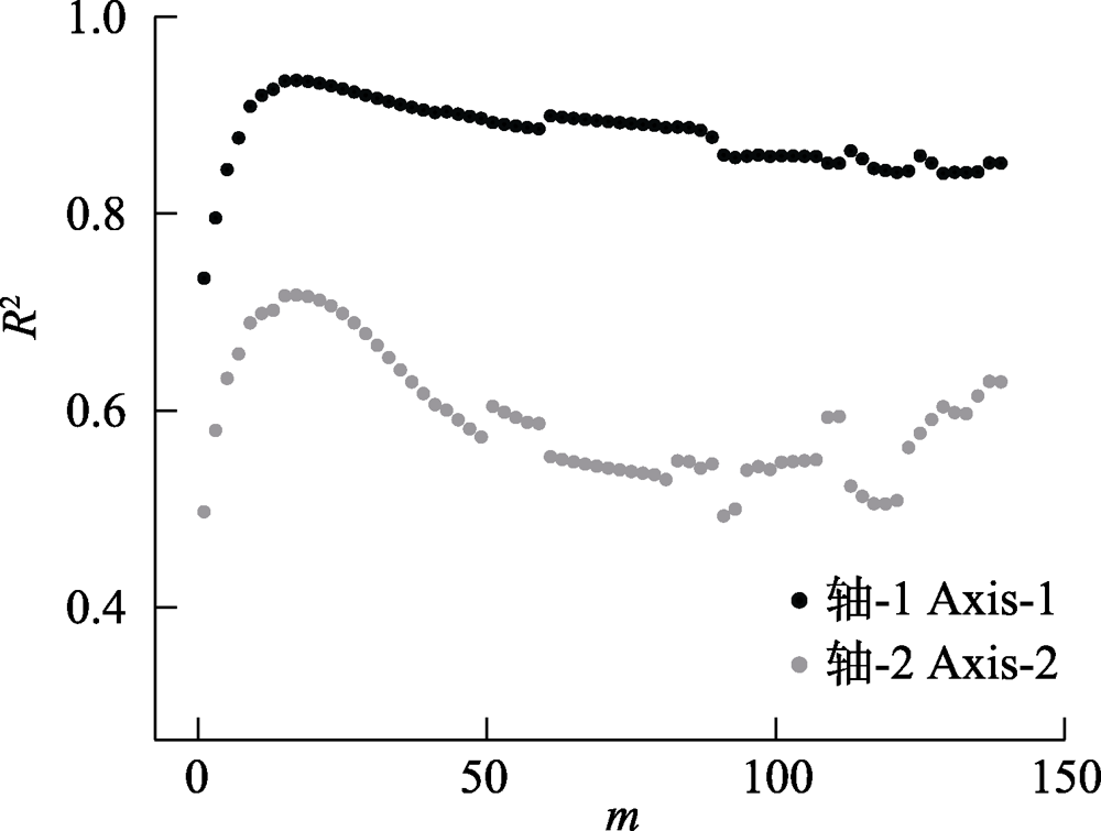 | 图3 基于弦标准化的预期共享物种数(CNESS)指数的主坐标分析(PCoA)排序产生的两个轴(Axis-1与Axis-2)与基于Chao-Jaccard的PCoA排序产生的两个轴分别进行线性回归后的回归系数(R2)在不同m值下的变化 |