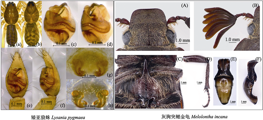 | Fig. 3 Species characteristic photos in permanent plot of agricultural soil animal (take Lysania pygmaea and Melolontha incana for example). (a) Male in dorsal view; (b) Female in dorsal view; (c) Male palp bulb in ventral view; (d) Male palp bulb in tetrolateral view; (e) Male palp in ventral view; (f) Male palp in retrolateral view; (g) Epigynum in ventral view; (h) Epigynum in retrolateral view. (A) Head in dorsal view; (B) Antennae; (C) Mesosternum process; (D) Hind leg; (E) Male genitalia in dorsal view; (F) Male genitalia in lateral view. |