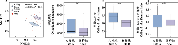 不同树种组成森林中土壤甲螨群落结构及生态指标差异。A: A样地与B样地甲螨群落的非度量多维标度排序(non-metric multi-dimensional scaling, NMDS)分析结果(Stress = 0.1457)。其中椭圆代表围绕A、B两个样地甲螨群落的标准偏差, 红色的十字(OTU)代表群落中的甲螨物种。B、C、D分别表示两样地甲螨多度、物种丰富度和Shannon多样性指数差异。其中方块表示数据分布, 横线表示中位数, 圆点表示极值。