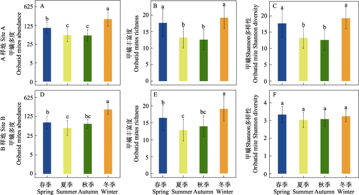 不同树种组成的两个样地间甲螨群落的季节动态变化并不完全相同(图3)。在A样地中, 4个季节甲螨多度(P < 0.001)、物种丰富度(P < 0.001)和Shannon多样性指数(P = 0.001)差异显著。而在B样地中, 甲螨多度(P < 0.001)和物种丰富度(P < 0.001)在4个季节间具有显著差异, 而Shannon多样性指数(P = 0.061)差异不显著。并且A样地中夏季和秋季甲螨多度、物种丰富度和Shannon多样性指数显著低于春季和冬季; 而B样地中秋季甲螨多度和物种丰富度与春季差异不显著。