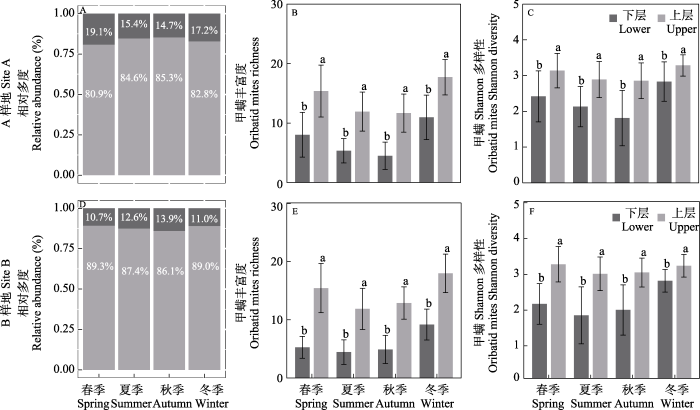 在两个不同树种组成的样地中, 4个不同季节的甲螨均表现出明显的表聚性, 上层(0-10 cm)土层中甲螨多度、物种丰富度和Shannon多样性指数均显著(P < 0.05)高于下层(10-20 cm) (图4)。但不同的是, A样地内夏季和秋季土壤甲螨相对多度为84.6%和85.3%, 高于冬季和春季的82.8%和80.9%; 而B样地内则相反, 冬季和春季土壤甲螨相对多度(89.0%和89.3%)高于夏季和秋季(87.4%和86.1%)。