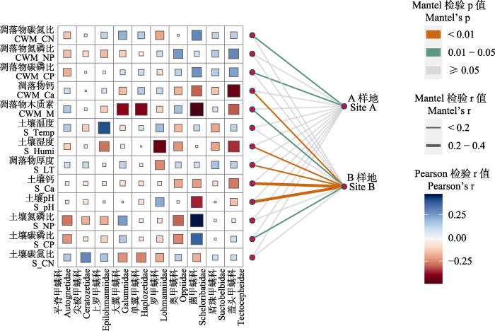 Pearson correlation analysis of the abundance of oribatid mites and environmental factors, and Mantel test of oribatid mites community and environmental factors in site A and site B. CWM_CN, Community weighted mean C/N ratio; CWM_NP, Community weighted mean N/P ratio; CWM_CP, Community weighted mean C/P ratio; CWM_Ca, Community weighted mean calcium content; CWM_M, Community weighted mean lignin content; S_Temp, Soil temperature; S_Humi, Soil humidity; S_LT, Soil litter thickness; S_Ca, Soil calcium content; S_pH, Soil pH value; S_NP, Soil N/P ratio; S_CP, Soil C/P ratio; S_CN, Soil C/N ratio.