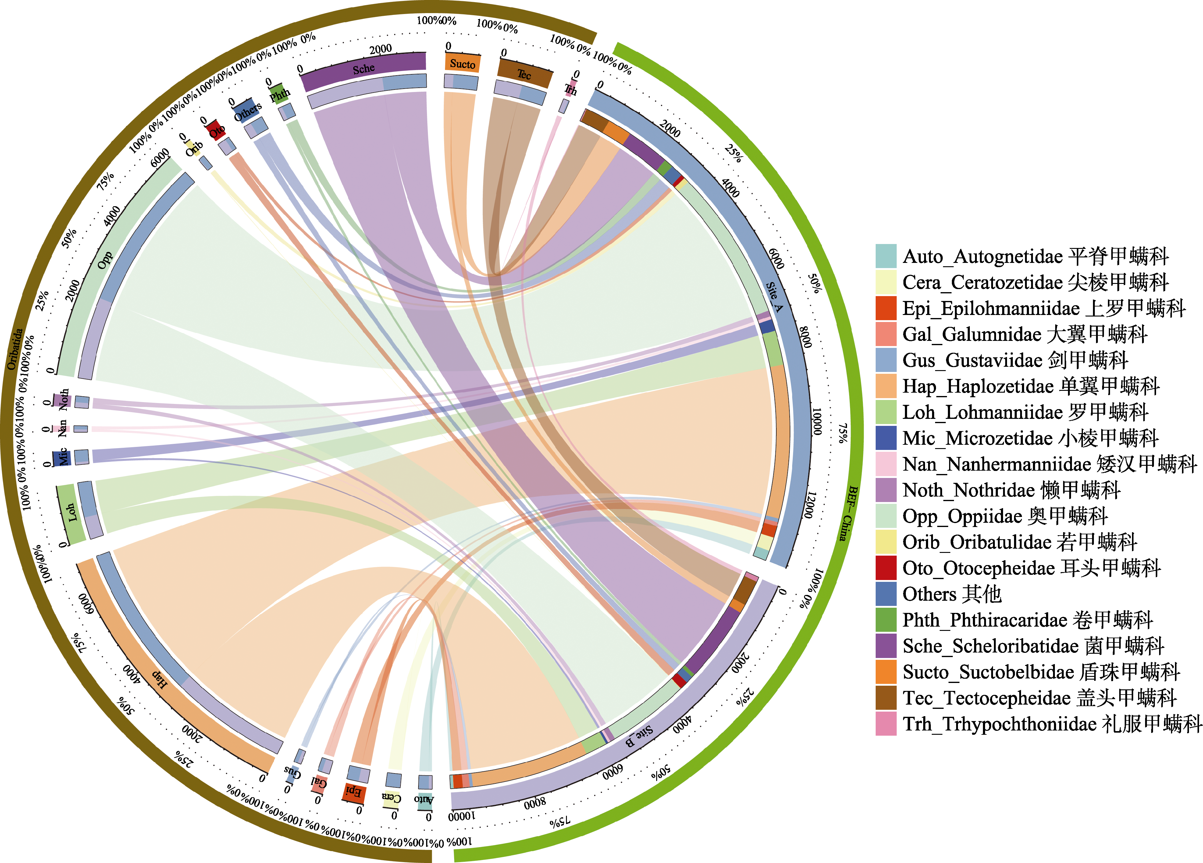 | Fig. 1 Community composition of oribatid mites in forests composited by different tree species. From outside circle to inside. The left side of the first circle is the name of Oribatida, the right side of the first circle is BEF-China. The second circle is percentage scale label (from 0?100%). The third circle is the family name and the site, the width of the line indicates the abundance of mites. We grouped the oribatid mite abundance less than 100 as others. |