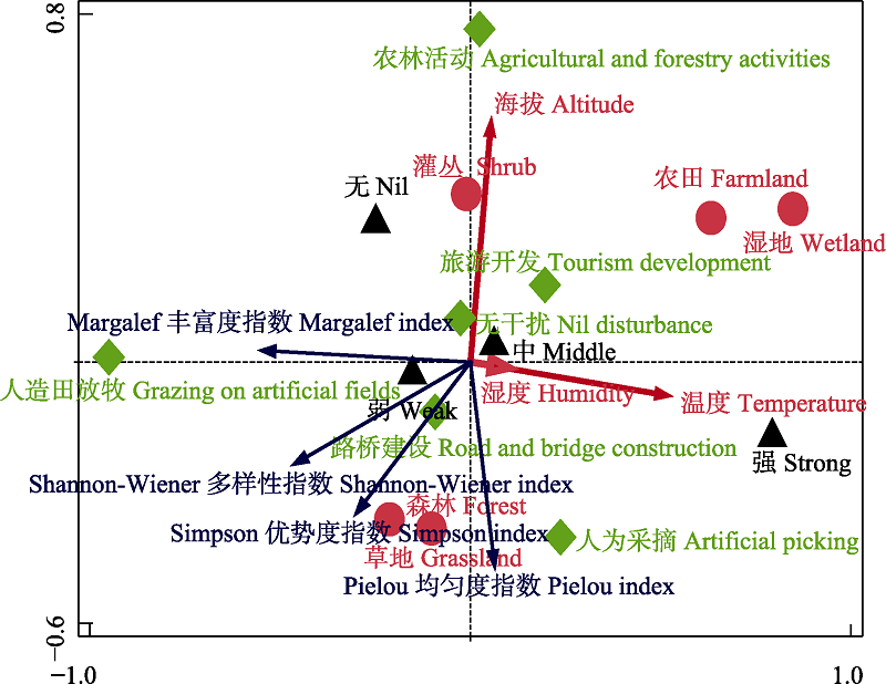 图7 燕山地区访花昆虫群落多样性与环境因子的RDA排序。 生境类型; 干扰程度; 干扰类型。 |