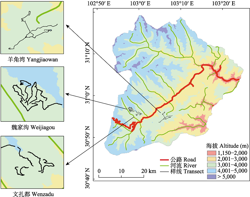| 图1 四川卧龙国家级自然保护区内绿尾虹雉野外调查样线分布图 |
