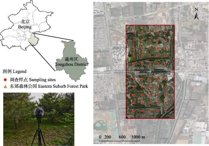 鸟类的繁殖具有季节性, 大多数鸟类在繁殖季节的叫声婉转响亮(韩宗先, 2001), 能够为声学监听识别提供可靠的信息来源。结合北京地区物候特征, 于2021年4-6月选择晴朗无风的工作日进行鸟类调查, 具体调查日期为4月23-24日、5月24-25日、6月18-19日。采用固定半径样点法, 在鸟类活跃时间段(7:00-11:00和16:00-18:00)观察记录出现在样点周围50 m范围内鸟的种类、数量和活动情况。观察员到达样点后先静止5 min后再进行观测, 每个样点观测5 min。所有调查均由同一位观察员完成, 调查之前需进行系统学习和培训, 以提高鸟类的识别技能并控制系统误差(杨刚等, 2015)。通过调查获得鸟类丰富度(即鸟类物种数)及多度(即鸟类个体数量)。