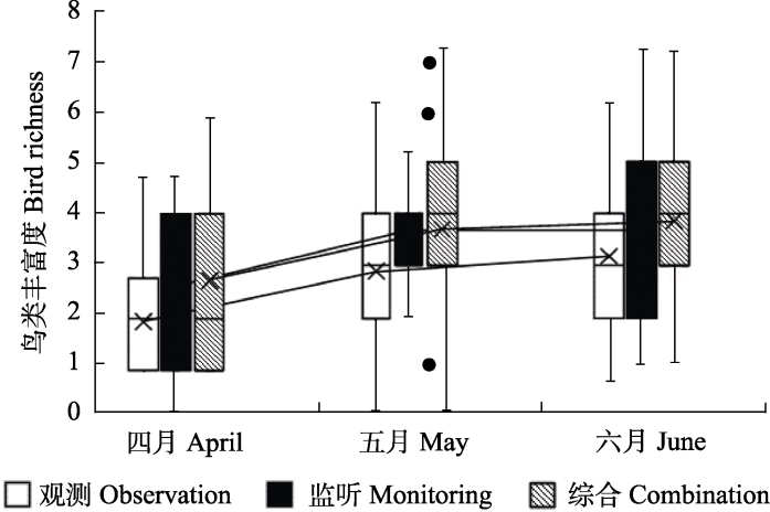 本研究通过样点法观测记录到鸟类33种2,475只, 通过频谱图辅助监听音频也记录到33种鸟类, 但未能直接获得具体数量。其中, 戴胜(Upupa epops)、金眶鸻(Charadrius dubius)仅在观测中被记录, 大杜鹃(Cuculus canorus)、银喉长尾山雀(Aegithalos glaucogularis)仅在监听识别中被记录。其他鸟种在两种方法均有记录, 占全部物种数的88.6%。综合两种方法获得4-6月东郊森林公园的鸟类共计35种, 隶属于10目23科(附录1)。其中鸣禽共记录到22种, 占整体的62.8%。在所有样点中, 麻雀(Passer montanus)和喜鹊(Pica pica)为优势种; 灰喜鹊(Cyanopica cyanus)、白头鹎(Pycnonotus sinensis)和金翅雀(Chloris sinica)为常见种。不同月份观测与监听的结果存在差异(图2), 样点间监听获得的物种平均值略高于直接观测记录, 这两种方法可相互补充以获得更完整的鸟类调查名录, 用于构建鸟类丰富度模型。