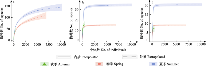 由稀疏外推曲线可知(图5), 不同季节的物种丰富度和Shannon-Wiener多样性以夏季最高, 秋季次之, 春季略低于秋季; Simpson多样性是夏季最高, 春季次之, 秋季最低。