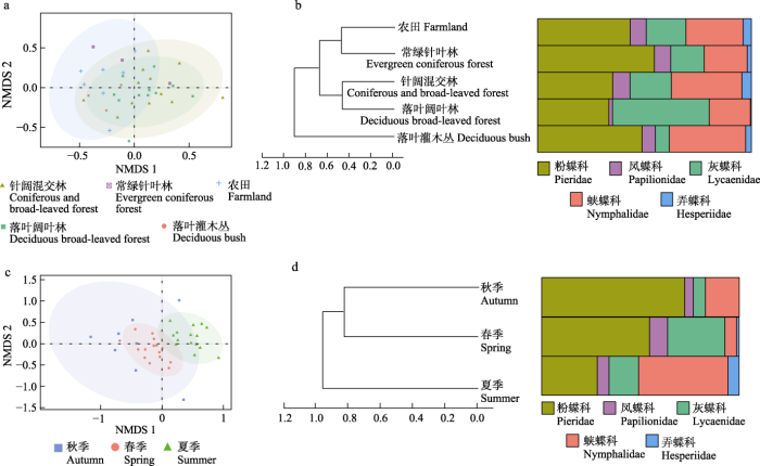 (a)不同生境的蝴蝶群落NMDS分析结果; (b)不同生境的蝴蝶群落UPGMA聚类分析结果; (c)不同季节的蝴蝶群落NMDS分析结果; (d)不同季节的蝴蝶群落UPGMA聚类分析结果。