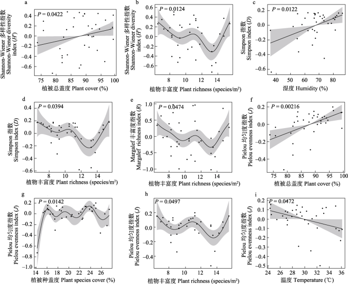 蝴蝶群落多样性对环境因子的广义加性模型拟合曲线